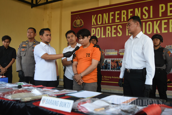 PELAKU MUTILASI - Tersangka Alvi mengakui perbuatannya, membunuh dan memutilasi korban TAS (25) gadis asal Lamongan yang merupakan pacarnya dalam pers rilis yang digelar Polres Mojokerto, Senin (8/9/2025). Tersangka dengan sering diomeli korban yang temperamental dan dituntut ekonomi untuk membeli barang dan kebutuhan hidup mewah. SURYA/AHMAD ZAIMUL HAQ