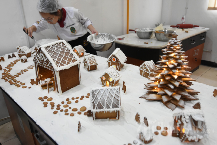 Mahasiswa Akademi Kuliner dan Patiseri OTTIMMO International menyelesaikan pembuatan rumah kue jahe sebagai pada UAS ganjil, Selasa (19/12/2023). Kue Jahe identik dengan sajian dekoratif di perayaan natal dibuat para mahasiswa ini dengan berbagai bentuk kota. Mulai dari gedung, jalan, rumah dibuat dari kue jahe yang direkatkan menggunakan adonan gula halus (icing sugar).SURYA/AHMAD ZAIMUL HAQ