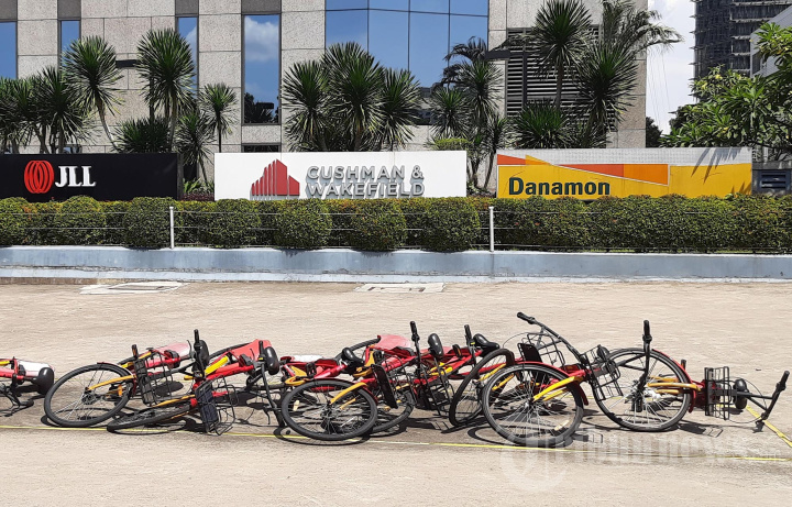 Deretan sepeda untuk layanan bike sharing atau penyewaan sepeda berjatuhan diterpa angin kencang di Kawasan Jalan Jendral Sudirman, Jakarta Selatan, Minggu (20/3/2022). Angin kencang melanda Jakarta, mengakibatkan sejumlah sepeda sewaaan berjatuhan. (Warta Kota/YULIANTO)