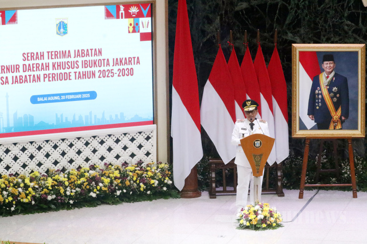 SERAH TERIMA JABATAN - Gubernur DKI Jakarta Pramono Anung memberikan sambutan usai serah terima jabatan di Balai Kota, Jakarta, Kamis (20/2/2025). Pramono Anung dan Rano Karno resmi mengemban tugas sebagai Gubernur dan Wakil Gubernur Jakarta periode 2025-2030. Warta Kota/Yulianto