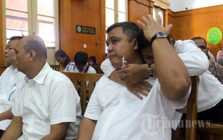 Terdakwa mantan Kadis PUPR Pemprov Sumut Topan Obaja Ginting (kanan) menangis sambil memeluk kerabatnya sebelum menjalani sidang perdana dugaan korupsi di Pengadilan Tipikor pada Pengadilan Negeri Medan, Rabu (19/11/2025). Agenda sidang JPU KPK membacakan dakwaan terhadap mantan Kadis PUPR Pemprov Sumut Topan Obaja Putra Ginting bersama Kepala UPTD Gunung Tua Dinas PUPR Sumut Rasuli Efendi Siregar tersandung kasus korupsi proyek jalan di Sumatra Utara. TRIBUN MEDAN/DANIL SIREGAR