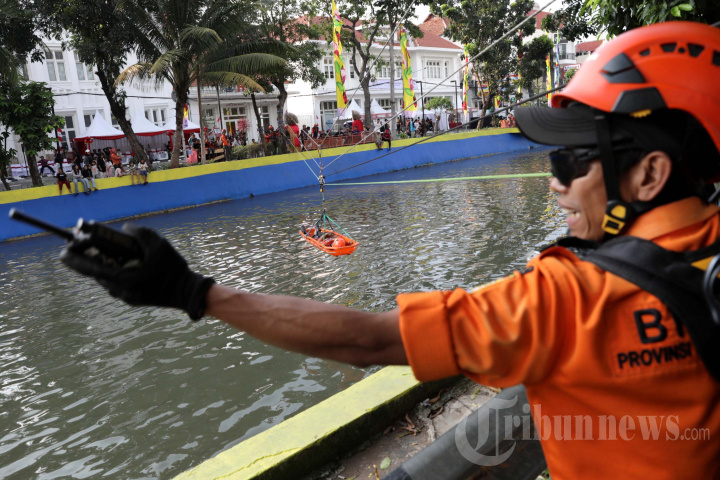 SIMULASI PENYELAMATAN - Petugas Badan Penanggulangan Bencana Daerah (BPBD) DKI Jakarta menggelar kegiatan simulasi penyelamatan di aliran Sungai Ciliwung Kecil, Jakarta, Jumat (20/6/2025). Kegiatan ini mendemonstrasikan teknik evakuasi korban di perairan serta penanganan darurat di sekitar bantaran sungai yang merupakan bagian dari rangkaian peringatan Hari Ulang Tahun (HUT) ke-498 Kota Jakarta. TRIBUNNEWS/IRWAN RISMAWAN