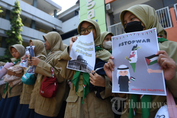 Siswa melakukan salat gaib, kumpulkan donasi dan aksi bentangkan poster perdamaian di halaman Sekolah SMP Muhammadiyah 4 Gadung Surabaya, Kamis (12/10/2023). Kegiatan ini dilakukan untuk menyikapi seruan Pimpinan Pusat (PP) Muhammadiyah agar memanjatkan doa dan salat gaib untuk para korban dari perang Israel dan Palestina. SURYA/HABIBUR ROHMAN