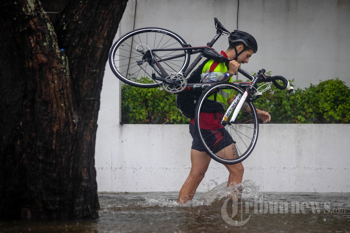 Seorang pengendara sepeda mengarungi jalan setapak yang banjir di dekat Norman Creek di Coorparoo, negara bagian Queensland Australia. Minggu (27 Februari 2022). (Patrick HAMILTON / AFP)
