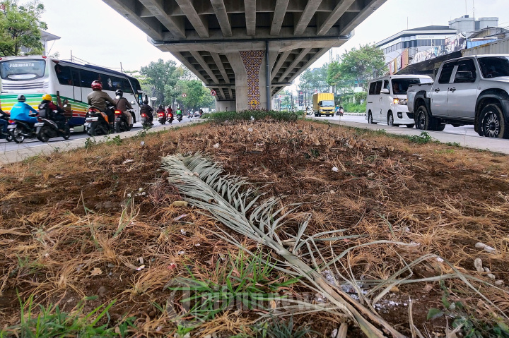 Pengguna jalan melewati taman yang tidak terawat di bawah Flyover Kopo, Kota Bandung, Jawa Barat, Senin (30/1/2023). Taman yang dihadirkan untuk menambah estetika atau keindahan area di bawah sepanjang jalan layang tersebut terlihat tidak pernah disiram dan dipelihara, di mana tanamannya banyak yang layu dan mengering, tumbuh tanaman dan rumput liar, serta banyak sampah berserakan. (TRIBUN JABAR/GANI KURNIAWAN)