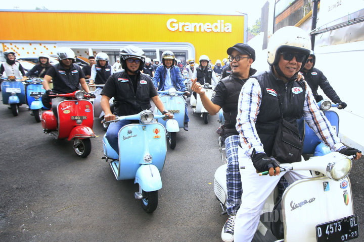 PENCINTA VESPA - Komunitas Vespa 60s Varis Van Java berfoto bersama penceramah Ustadz Evie Effendi melanjutkan riding ke tempat acara dalam kegiatan Tebar Hikmah Ramadan (THR) volume 3, dari Toko Gramedia, Jalan Buahbatu, Kota Bandung, Jawa Barat, Kamis (13/3/2025). Dalam kegiatan ini, para rider Vespa 60s Varis Van Java juga mengikuti ceramah yang disampaikan Ustadz Evie Effendi di Wood Case Coffee dan dilanjutkan dengan aksi sosial memberikan santunan kepada 40 anak yatim yang ada di Kota Bandung. Kegiatan ini merupakan agenda tahunan yang akan terus dilaksanakan agar semua anggota 60s Paris Van Java tetap solid sekaligus untuk menebar kebaikan saat bulan suci Ramadan. (TRIBUN JABAR/GANI KURNIAWAN)