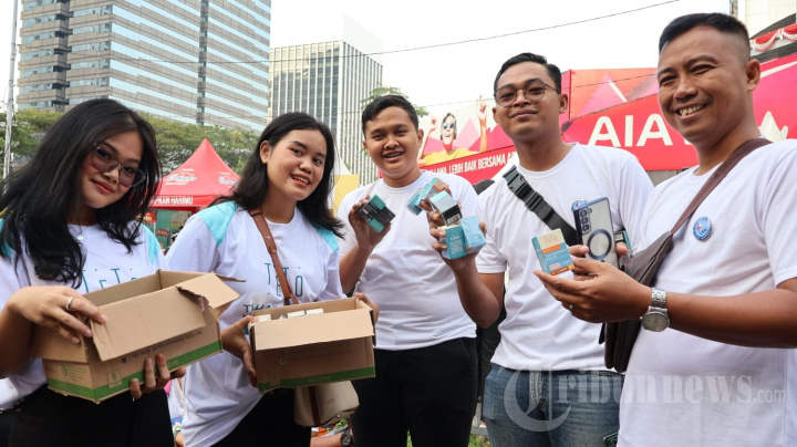 Teto dan Mie Kober diberikan produk Teto Antiperspirant dan sarapan spesial dari Mie Kober yang dibagikan secara gratis senilai 500 juta untuk warga masyakarat yang beraktivitas Car Free Day (CFD) di depan kawasan FX Sudirman, Jakarta, Minggu (1 September 2024). (TeamTeto/HO/Tribunnews)