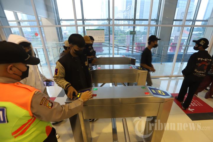 Penumpang melakukan tap pembayaran Stasiun BNI City, Jakarta Pusat, Sabtu (30/7/2022). Stasiun BNI City mulai Sabtu (30/7/2022) menguji coba layanan bagi penumpang KRL Commuter Line untuk mengurai kepadatan penumpang di Stasiun Sudirman dan Stasiun Karet, dimana sebelumnya stasiun tersebut hanya melayani penumpang kereta bandara. Tribunnews/Jeprima