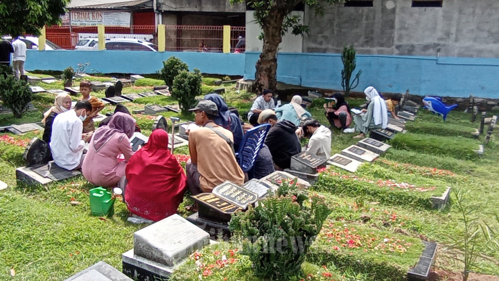 ZIARAH KUBUR - Pemakaman Wakaf Babakan Semboja, Kota Tangerang, di hari pertama lebaran ini dipadati para peziarah, Senin (2/5/2022). Membludaknya peziarah memberi rejeki nomplok bagi para pedagang yang berjualan makanan, minuman maupun jasa di sekitaran malam. WARTA KOTA/NUR ICHSAN