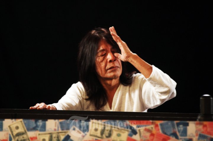 VIDEO KLIP LAGU UANG - Musisi, pencipta lagu, serta gitaris grup musik rock legendaris 'God Bless', Ian Antono tengah berproses pembuatan video klip lagu ciptaannya berjudul 'Uang', dilantumkan oleh penyanyi cock Indonesia Nicky Astria, Minggu (16/3/2014) di Bulungan Jakarta. Rencana peluncuran album barunya ini akan diluncurkan April 2014. Inilah suasana pengambilan gambar video klip lagu berjudul 'Uang' bersama pantominya yang digarap oleh Nugroho. (TRIBUNNEWS.COM/FX ISMANTO)