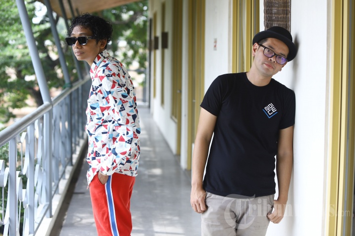 Personel band T-Five Beben (bass) dan Paul (vokalis) berpose saat ditemui usai menghadiri acara di Jakarta, Selasa (9/4/2019). T-Five akan mengisi acara konser Ketje Flashback 90s Music Ancol, yang akan diadakan pada pada tanggal 13 April hingga 28 April 2019. TRIBUNNEWS/HERUDIN
