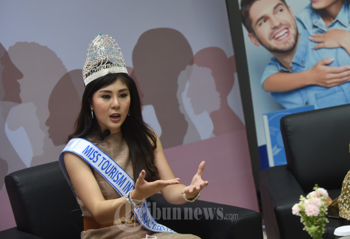 TRIBUNNEWS.COM, JAKARTA - Miss Tourism International 2021 Jessy Silana Wongsodiharjo memberikan pemaparan dalam talkhsow tema Peran Perempuan Bagi Pariwisata Melalui Konten Digital yang diselenggarakan oleh QNET, Jakarta (14/3/2022). //IST
