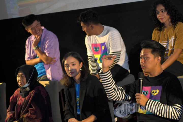 Sutradara sekaligus pemain film Lara Ati, Bayu Skak (depan, kanan) bersama para pemain lainnya, di antaranya Tatjana Saphira (depan, tengah) dan Sahila Hisyam (belakang, kanan) saat acara Press Screening Film Lara Ati di Grand City Mall, Kota Surabaya, Jawa Timur, Kamis (8/9/2022). Film layar lebar yang menjadi debut Bayu Skak sebagai sutradara tunggal kembali membawa unsur lokal dan gaya tutur dalam Bahasa Jawa dengan latar lokasi Kota Surabaya. Bayu Skak mengangkat kisah kegelisahan muda-mudi Jawa Timur dalam menghadapi fase dewasa atau quarter life crisis dengan menambah unsur komedi romantis. SURYA/AHMAD ZAIMUL HAQ