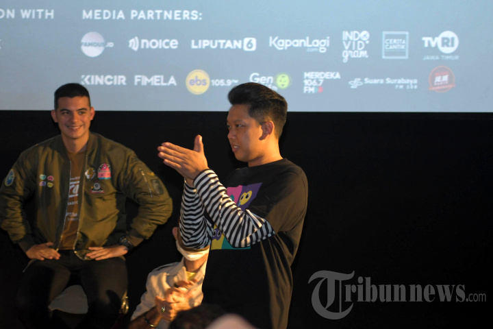 Sutradara sekaligus pemain film Lara Ati, Bayu Skak (kanan) saat acara Press Screening Film Lara Ati di Grand City Mall, Kota Surabaya, Jawa Timur, Kamis (8/9/2022). Film layar lebar yang menjadi debut Bayu Skak sebagai sutradara tunggal kembali membawa unsur lokal dan gaya tutur dalam Bahasa Jawa dengan latar lokasi Kota Surabaya. Bayu Skak mengangkat kisah kegelisahan muda-mudi Jawa Timur dalam menghadapi fase dewasa atau quarter life crisis dengan menambah unsur komedi romantis. SURYA/AHMAD ZAIMUL HAQ
