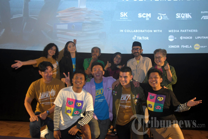 Sutradara sekaligus pemain film Lara Ati, Bayu Skak (depan, kanan) bersama para pemain lainnya, di antaranya Tatjana Saphira (belakang, kedua kiri) dan Sahila Hisyam (belakang, kiri) saat acara Press Screening Film Lara Ati di Grand City Mall, Kota Surabaya, Jawa Timur, Kamis (8/9/2022). Film layar lebar yang menjadi debut Bayu Skak sebagai sutradara tunggal kembali membawa unsur lokal dan gaya tutur dalam Bahasa Jawa dengan latar lokasi Kota Surabaya. Bayu Skak mengangkat kisah kegelisahan muda-mudi Jawa Timur dalam menghadapi fase dewasa atau quarter life crisis dengan menambah unsur komedi romantis. SURYA/AHMAD ZAIMUL HAQ