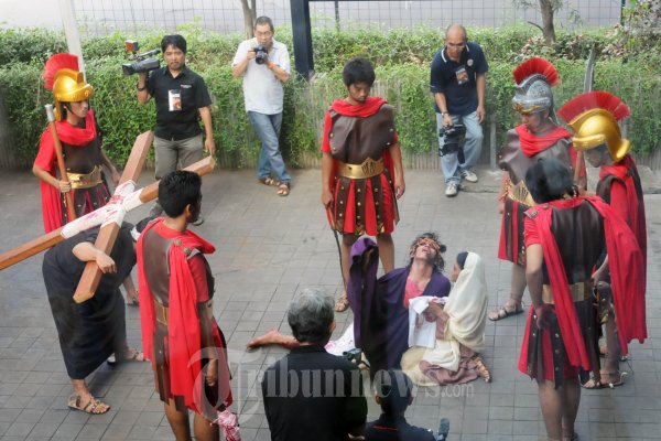 KISAH SENGSARA YESUS KRISTUS DI KAYU SALIB - Muda mudi katholik Keluarga Besar Paroki Gereja Santa Maria Regina (SANMARE) tergabung dalam Bina Iman Remaja (BIR) dan Orang Muda Katholik (OMK) melakukan drama visualisasi prosesi penyaliban Yesus, Jumat (31/3/2013) di Gereja Sanmare, Bintaro Jaya, Tangerang, Benten. Prosesi tersebut merupakan bagian dari perayaan Jumat Agung yang mengisahkan kesengsaraan Yesus Kristus untuk menebus dosa manusia dan merupakan bagian dari ibadah Paskah. Drama ini disutradarai oleh Daniel H Jacob dan penulis naskah Ariobimo Nusantara. (TRIBUNNEWS.COM/FX ISMANTO)