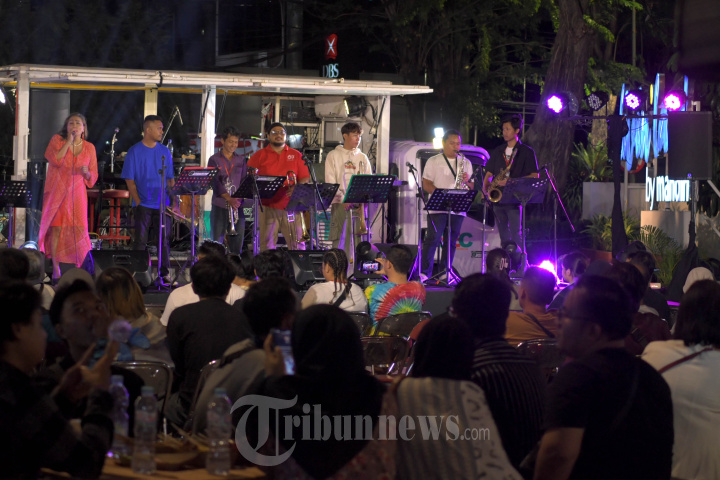 CARAVAN JAZZ FIESTA - Kemeriahan Caravan Jazz Fiesta 2023 di di Mandiri Living Land, Jalan Pemuda, Surabaya, Jumat (11/8/2023) malam. Enam group band jazz lintas kota asal Surabaya, Malang dan Bali. Korek (Komunitas Arek) Jazz (Surabaya), Sweet Swing Noff (Surabaya), Hi Beats (Surabaya) Orange Band, Dhanny Quartet (Malang) dan Stone Cold Killers (Bali) tampil dalam gelaran yang digagas Surabaya Pahlawan Jazz bersama Indah Kurnia. SURYA/AHMAD ZAIMUL HAQ