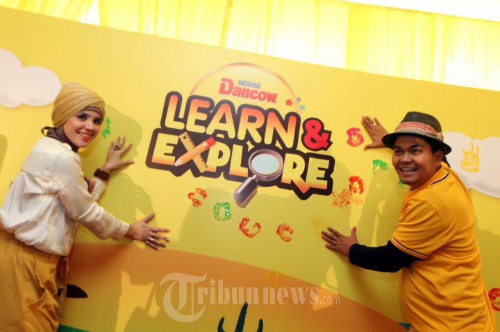 Presenter Indra Bekti bersama Istri Aldilla Jelita saat melakukan cap tangan di dinding Learn & Explore saat peluncuran program "Dancow Learn & Explore" di FX Mall, Jakarta Selatan, Selasa (2/7/2013). PT Nestle Indonesia meluncurkan Dancow Learn Explore yang akan di gelar 6-7 Juli 2013 di Atrium Taman Anggrek. (Tribun Jakarta/Jeprima)