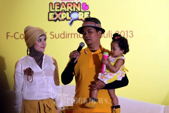 Presenter Indra Bekti bersama Istri dan putrinya Aldilla Jelita dan Dafania Sahira Indrabekti saat menghadiri acara peluncuran program "Dancow Learn & Explore" di FX Mall, Jakarta Selatan, Selasa (2/7/2013). PT Nestle Indonesia meluncurkan Dancow Learn Explore yang akan di gelar 6-7 Juli 2013 di Atrium Taman Anggrek. (Tribun Jakarta/Jeprima)