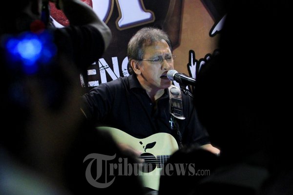 Musisi Virgiawan Listanto atau lebih dikenal Iwan Fals saat menghadiri acara konferensi pers Wings Food yang meluncurkan produk barunya 'TOP' yang merupakan coffee campuran antara robusta dan arabica di Planet Hollywood, Kuningan, Jakarta Selatan, Kamis (26/07/2012). Iwan Fals mengaku kopi membantu memudahkannya dalam berkreativitas. "Bisa dibilang lagu-lagu saya dari tahun tujuhpuluhan itu terdorong dari kopi juga," ucap (Tribun Jakarta/Jeprima)