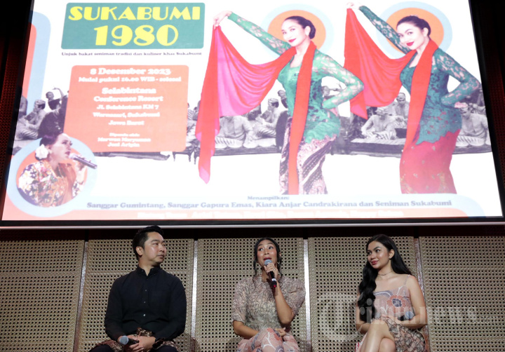 Progran Manager Bakti Budaya Djarum Foundation Billy Gamaliel (kiri) bersama Artis Happy Salma (tengah) dan Ariel Tatum (kanan) memberikan keterangan saat konferensi pers pagelaran seni 'Sukabumi 1980' di Galeri Indonesia Kaya, Jakarta, Jumat (1/12/2023). Titimangsa didukung oleh Bakti Budaya Djarum Foundation menghadirkan pagelaran seni dalam bingkai lestari tradisi bertajuk 'Sukabumi 1980' yang mengangkat kebudayaan sunda yang dibalut dengan seni tari, musik karawitan dan sinden. TRIBUNNEWS/IRWAN RISMAWAN