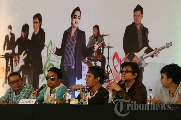 Personel grup musik Java Jive menjawab pertanyaan wartawan saat jumpa pers di Trans Studio Mall, Makassar, Kamis (30/5/2013). Band yang berusia 20 tahun ini hadir di Makassar dalam acara Live Musik Java Jive yang dipromotori oleh Trans Event Production dan Trans Studio Makassar. TRIBUN TIMUR/SANOVRA JR