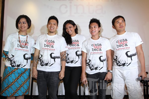 Para pemain film 'Cinta Tapi Beda', Ayu Dyah Pasha, Reza Nangin, Agni Pratistha Arkadewi Kuswardono, Hudson Pranajaya, dan sutradara Hanung Bramantyo (ki-ka) berfoto bersama seusai media jungket film mereka di Bellys Clan, Grand Intiland, Kawasan Sudirman, Jakarta Selatan, Senin (12/11/2012). (Tribun Jakarta/Jeprima)