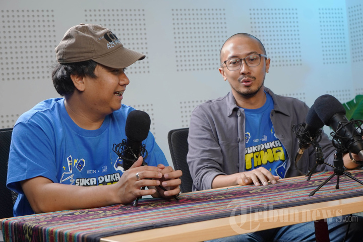 SUKA DUKA TAWA - Sutradara film Suka Duka Tawa Aco Tenriyagelli (kiri) dan pemain film Suka Duka Tawa Gilang Bhaskara (kanan) berikan keterangan dalam siniar Si Paling Seleb di Studio Tribun Network, Jalan Palmerah Selatan, Jakarta Pusat, Senin (11/10/2025). Dalam siniar tersebut, mereka mengaku sulit menahan tawa saat proses syuting film bergenre komedi tersebut. TRIBUNNEWS/LENDY RAMADHAN