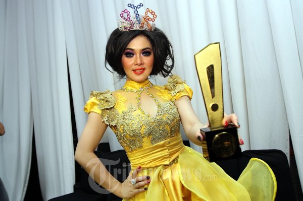 Penyanyi solo wanita Syahrini saat menunjukan penghargaan yang didapat pada acara ulang tahun Insert yang ke 9 di Gedung Trans TV, Jalan Mampang Prapatan, Jakarta Selatan, Rabu (24/10/2012) malam. (Tribun Jakarta/Jeprima)