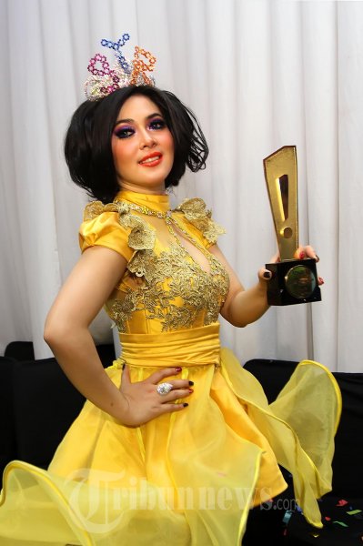 Penyanyi solo wanita Syahrini saat menunjukan penghargaan yang didapat pada acara ulang tahun Insert yang ke 9 di Gedung Trans TV, Jalan Mampang Prapatan, Jakarta Selatan, Rabu (24/10/2012) malam. (Tribun Jakarta/Jeprima)