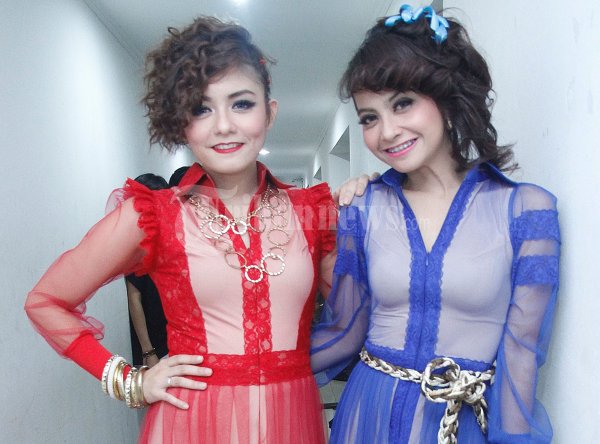 Grup duo T2 yang beranggotakan Kartika Yudia Ramlan (Tika) dan Prastiwi Dwiarti (Tiwi) seusai tampil pada acara musik LAMP10N 100% IKHLAS di Gedung Kesenian Jakarta, Jakarta Pusat, Kamis (26/7/2012) malam. (Tribun Jakarta/Jeprima)
