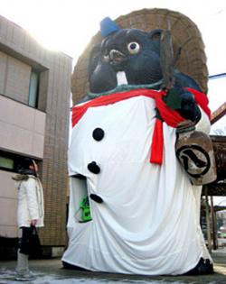 Patung Kakun (binatang mamalia dari Amerika Utara, di depan Stasiun Shigaraki, Perfektur Shiga Jepang, berubah menjadi Snowman.