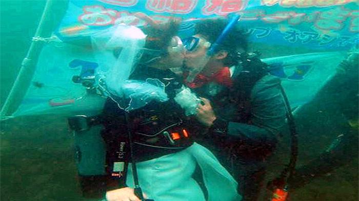 Sepasang pengantin baru melangsungkan pernikahan di dalam air, di Pantai Yunohama sambil menyelam bersama.
