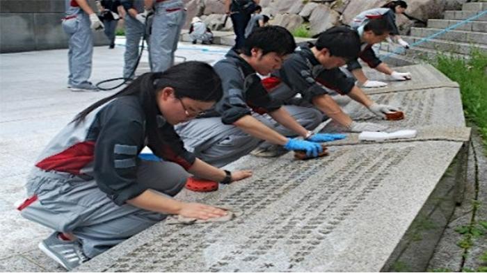 Peringatan itu dilakukan oleh 50 karyawan baru JAL dengan membersihkan batu memorial di taman memorial Ireinosono