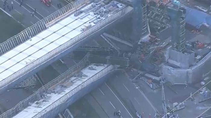 Namun mendadak jalan raya layang seperti jembatan itu tersebut ambruk dan menghantam seorang pekerja dan seorang polisi di sana.