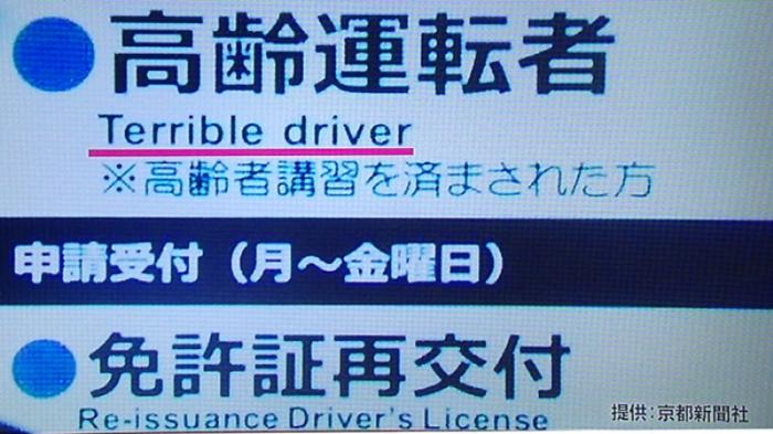 Papan petunjuk arah untuk pengemudi lanjut usia (lansia) yang benar tertulis dalam bahasa Jepang sebagai Koreisha, tetapi diterjemahkan ke dalam bahasa Inggris menjadi Terrible atau bahasa Indonesia menjadi: mengerikan, dahsyat, buruk sekali, ngeri, gawat dan semacamnya.