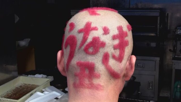 Akifumi Ueda (57), karyawan di Shingu punya kepala dengan potongan rambut sangat unik. Ada tulisan Unagi warna merah membuat banyak orang yang lewat tersenyum, sambil membakar dan menjual unagi di tokonya.
