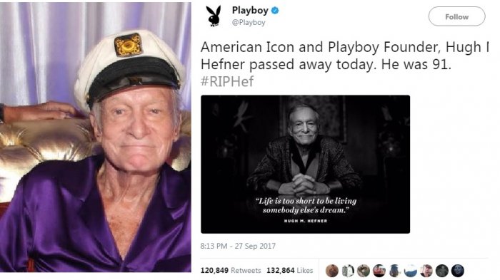 Dalam pemberitahuan hari Kamis (28/9/2017) pagi ini, hanya disebutkan Hefner meninggal “hari ini”.