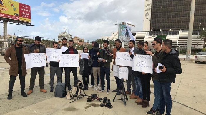 Tulisan tersebut berisi, "Libya tanpa media" dan "Jurnalisme bukan kejahatan".