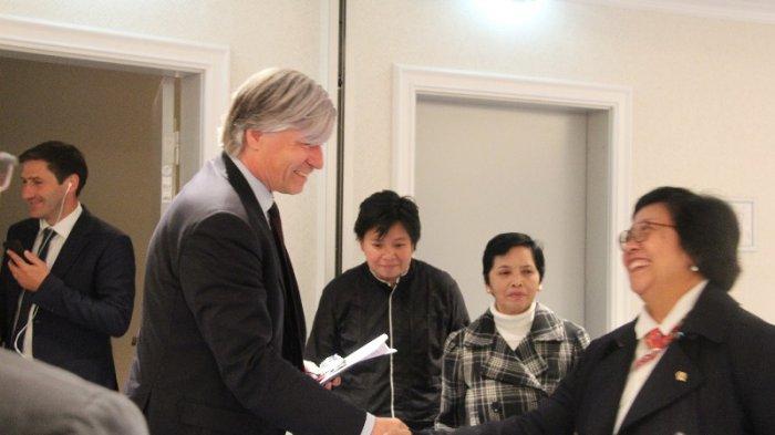 Bersama Menteri Siti, hadir Duta Besar Republik Indonesia untuk Norwegia Todung Mulya Lubis, Dirjen Pengendalian Perubahan Iklim Kementerian Lingkungan Hidup dan Kehutanan (KLHK) Ruandha Agung Sugardiman dan Dirjen Konservasi Keanekaragaman Hayati KLHK Wiratno.