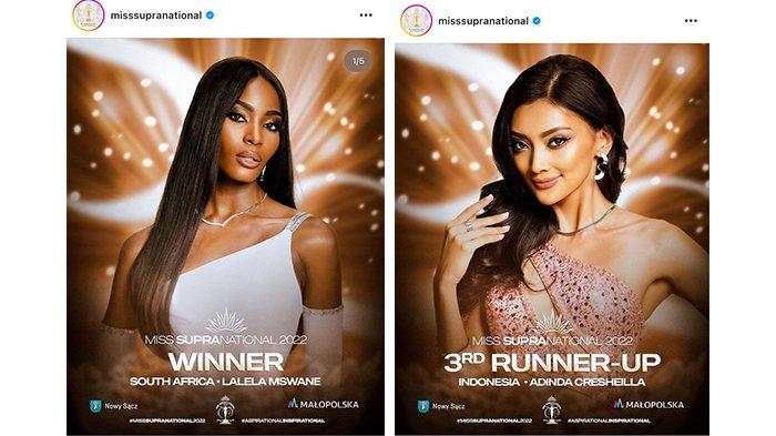 Wakil Afrika Selatan, Lalela Mswane dinobatkan sebagai Miss Supranational 2022. Wakil Indonesia, Adinda Cresheilla di runner-up ke-3.