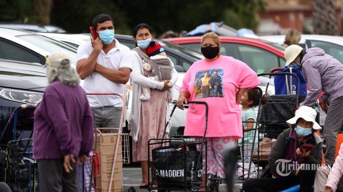 TRIBUNNEWS.COM, CALIFORNIA - Orang-orang terlihat mengantre untuk mendapatkan paket makanan gratis yang dibagikan relawan dari berbagai komunitas masyarakat dan keagamaan.