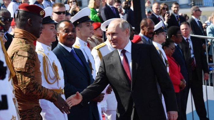 TRIBUNNEWS.COM - Presiden Rusia, Vladimir Putin, melihat kapal perang dan kapal selam nuklir di St. Peterburg, Rusia, pada Hari Angkatan Laut Rusia, Minggu (30/7/2023).