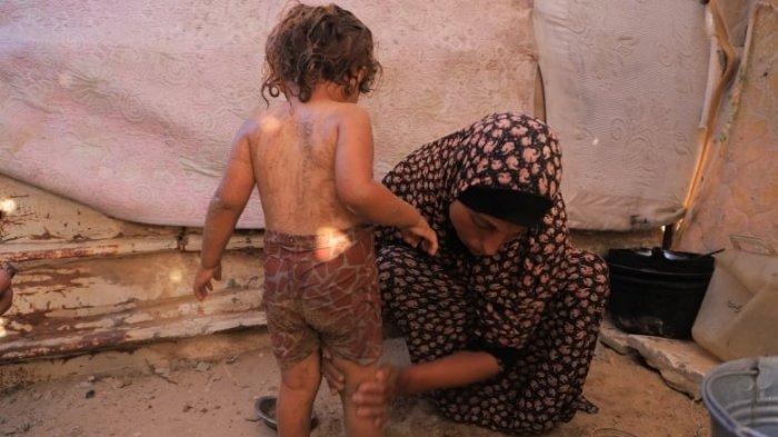 TRIBUNNEWS.COM - Di sebuah tenda tempat penampungan di Khan Younis, seorang ibu memandikan anaknya dengan pasir dan sedikit air.