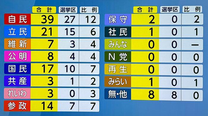 Dalam pemilu kali ini: LDP hanya meraih 39 kursi, turun dari sebelumnya 52 kursi; Partai Komeito hanya memperoleh 8 kursi, turun dari 14 kursi