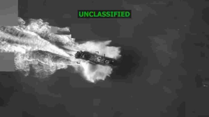 SOUTHCOM turut merilis video udara yang memperlihatkan kapal tersebut sebelum dihantam rudal dan meledak.