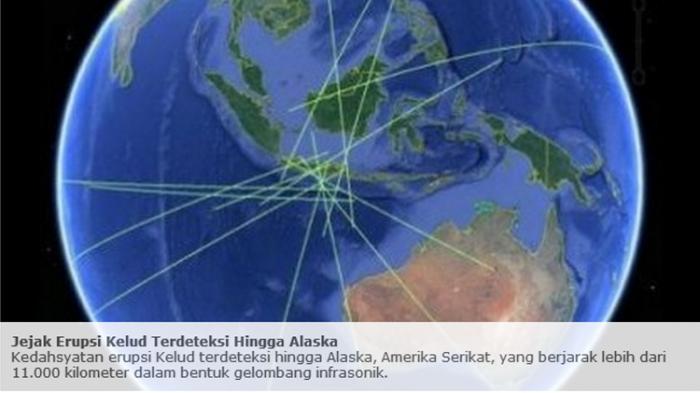 Kedahsyatan erupsi Kelud terdeteksi hingga Alaska, Amerika Serikat, yang berjarak lebih dari 11.000 kilometer dalam bentuk gelombang infrasonik.