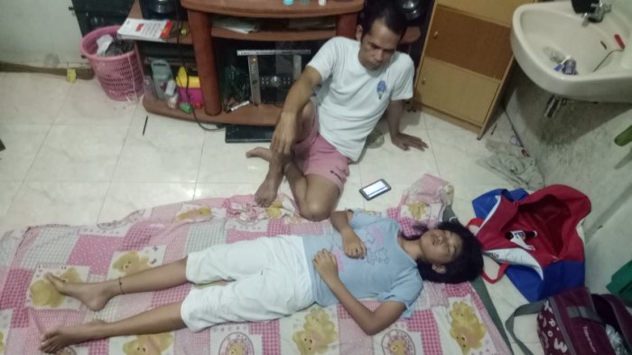 TRIBUNNEWS.COM, BANJARMASIN - Suami istri, Mulyadi dan Lili, setia menunggu dan melayani makan, minum, dan buang air anaknya, Siti Raisa Miranda alias Echa (13), yang tertidur selama 13 hari.