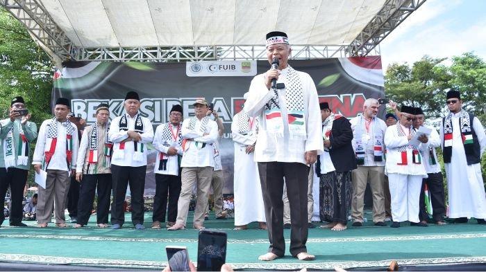 TRIBUNNEWS.COM - Tabligh Akbar dalam rangka Aksi Bekasi Bela Palestina, di depan Stadion Wibawa Mukti Cikarang, Kabupaten Bekasi, Jawa Barat, Minggu (15/6/2025) berlangsung meriah.