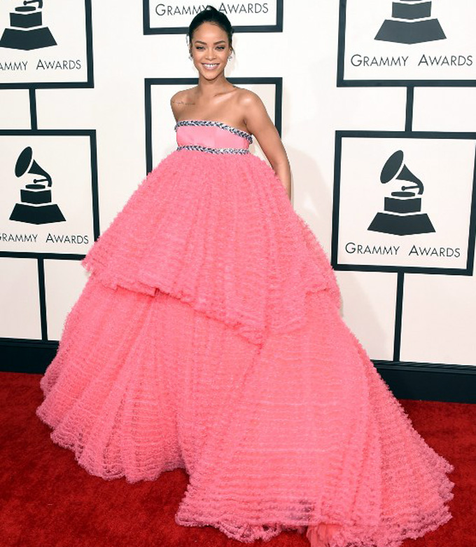 Alih-alih gaun seksi, Rihanna "mengambil risiko" dalam balutan gaun strapless merah muda bersiluet A nan megar rancangan desainer Italia Giambattista Valli.